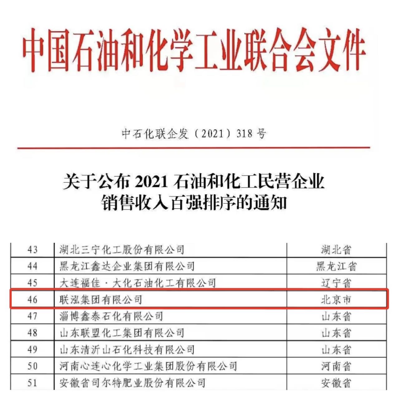 12月28日,中國石油和化學(xué)工業(yè)聯(lián)合會發(fā)布了2021中國石油和化工民營企業(yè)銷售收入百強榜單。聯(lián)泓集團有限公司位列第46位。
