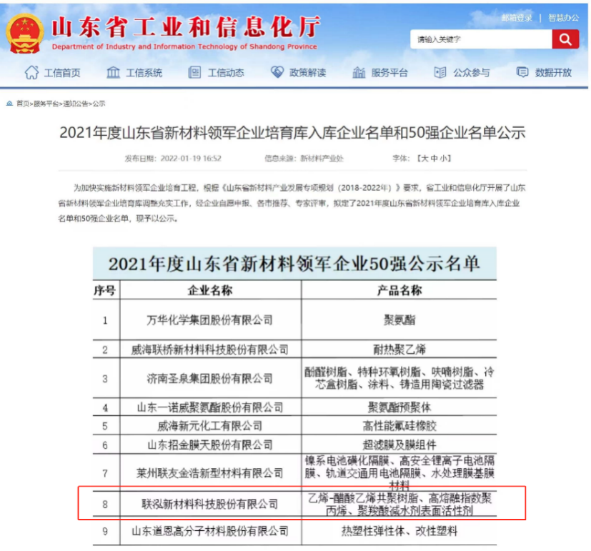 為加快實施新材料企業(yè)培育工程,發(fā)揮新材料產(chǎn)業(yè)的戰(zhàn)略新興作用,近日,山東省工業(yè)和信息化廳對企業(yè)產(chǎn)業(yè)鏈、銷售收入、科技研發(fā)等進行綜合評估,公示了山東省新材料領(lǐng)軍企業(yè)50強。聯(lián)泓新科上榜。