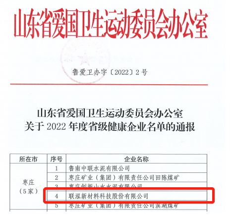 12月19日,山東省愛國衛(wèi)生運(yùn)動(dòng)委員會(huì)辦公室通報(bào)2022年度省級(jí)健康企業(yè)名單,聯(lián)泓新材料獲評(píng)“2022年度省級(jí)健康企業(yè)”。