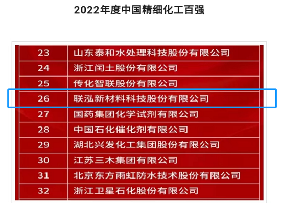 1月11日,第二十二屆全國精細(xì)化工原料及中間體行業(yè)峰會暨2022中國精細(xì)化工百強(qiáng)發(fā)布會在江蘇無錫舉行。會上發(fā)布了“2022年度中國精細(xì)化工百強(qiáng)”榜單,聯(lián)泓新材料位列第26位。