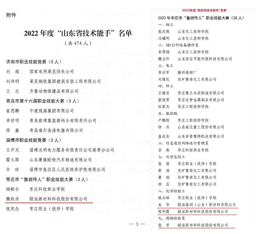 近日,山東省人力資源和社會保障廳、棗莊市人力資源和社會保障局分別公布了2022年度“山東省技術能手”名單、2022年度“棗莊市技術能手”名單。憑借在2022年棗莊市“魯班傳人”職業(yè)技能大賽的突出表現(xiàn),聯(lián)泓新材料檢驗檢測中心魏秋連被授予2022年度“山東省技術能手”榮譽稱號,檢驗檢測中心龍華、程利霞、張芳3名員工被授予2022年度“棗莊市技術能手”榮譽稱號。