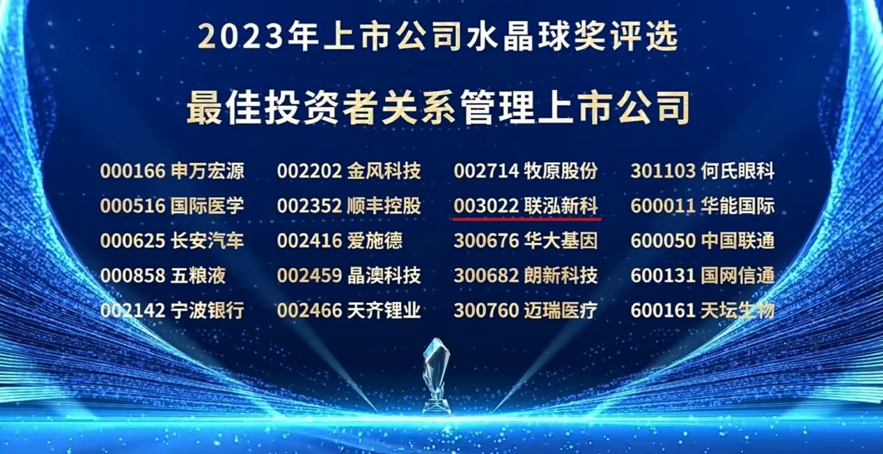 水晶球獎評選范圍包括A股和港股上市公司,10位上市公司領(lǐng)導人獲評“2023年度最佳總裁/總經(jīng)理/CEO”,40家上市公司獲評“2023年最佳投資者關(guān)系管理上市公司”。未來,聯(lián)泓新科將繼續(xù)提升公司治理和投資者關(guān)系管理水平,努力為投資者創(chuàng)造更大價值。