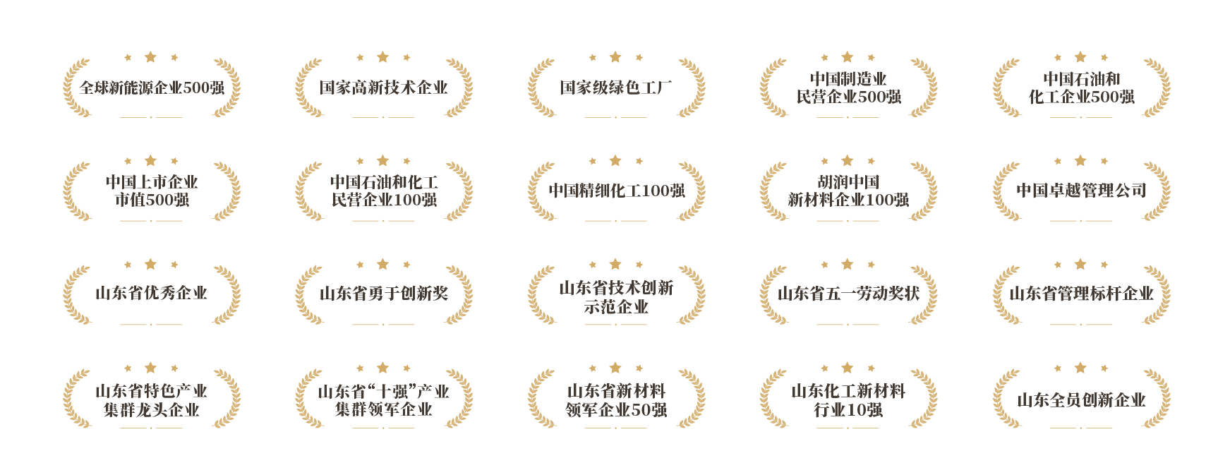 公司獲評(píng)全球新能源企業(yè)500強(qiáng)、中國石油和化工企業(yè)500強(qiáng)、中國石油和化工民營企業(yè)百強(qiáng)、中國精細(xì)化工百強(qiáng)、中國卓越管理公司、胡潤中國新材料企業(yè)百強(qiáng)、山東省優(yōu)秀企業(yè)、山東省特色產(chǎn)業(yè)集群龍頭企業(yè)、山東省“十強(qiáng)”產(chǎn)業(yè)集群領(lǐng)軍企業(yè)、山東省新材料領(lǐng)軍企業(yè)、山東省管理標(biāo)桿企業(yè)、山東省技術(shù)創(chuàng)新示范企業(yè)、山東省勇于創(chuàng)新企業(yè)等榮譽(yù)稱號(hào);擔(dān)任中國石油和化學(xué)工業(yè)聯(lián)合會(huì)新材料專業(yè)委員會(huì)副主任委員單位、中國洗滌用品工業(yè)協(xié)會(huì)理事單位、中國石油和化學(xué)工業(yè)聯(lián)合會(huì)環(huán)氧衍生表面活性劑及精細(xì)化學(xué)品專業(yè)委員會(huì)副主任委員單位、中國企業(yè)聯(lián)合會(huì)會(huì)員單位。公司股票已入選深證成指、深股通、富時(shí)羅素大盤股、滬深300備選股、中證光伏產(chǎn)業(yè)指數(shù)名單,連續(xù)兩年獲深交所信息披露工作考評(píng)A級(jí)。
